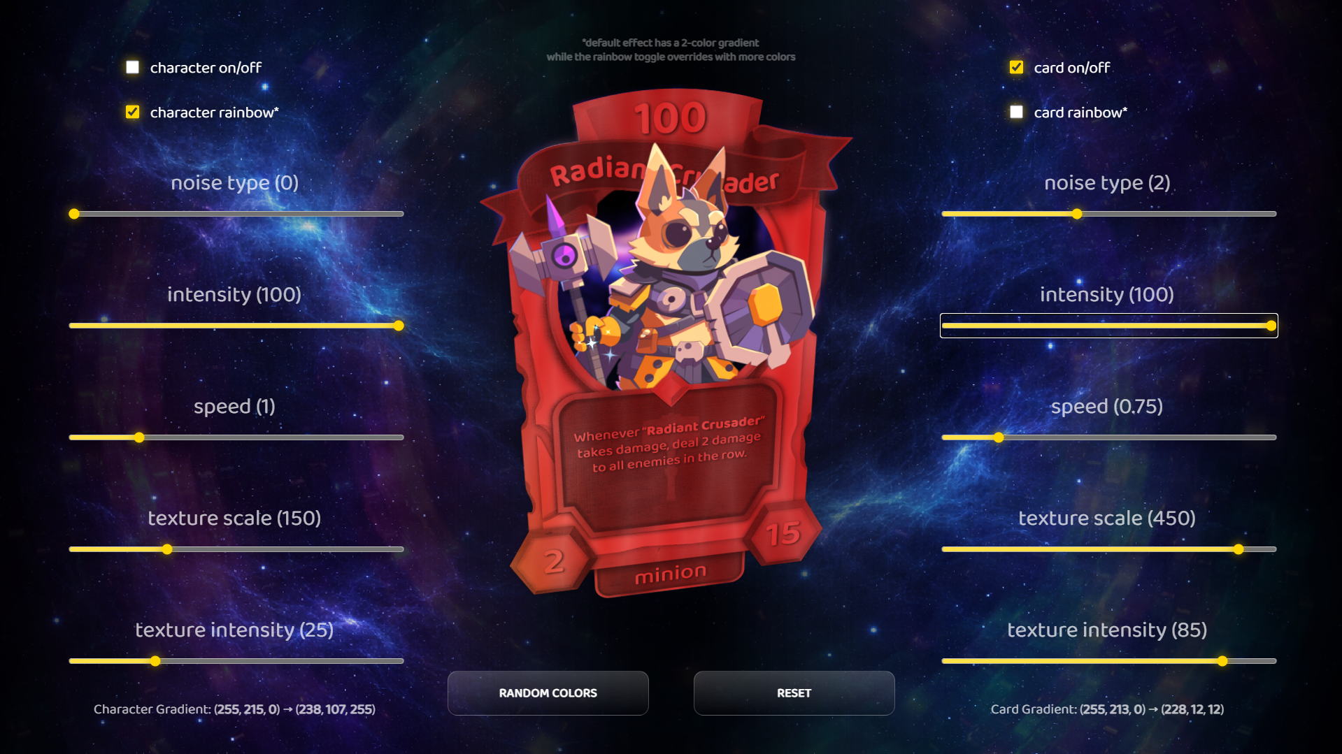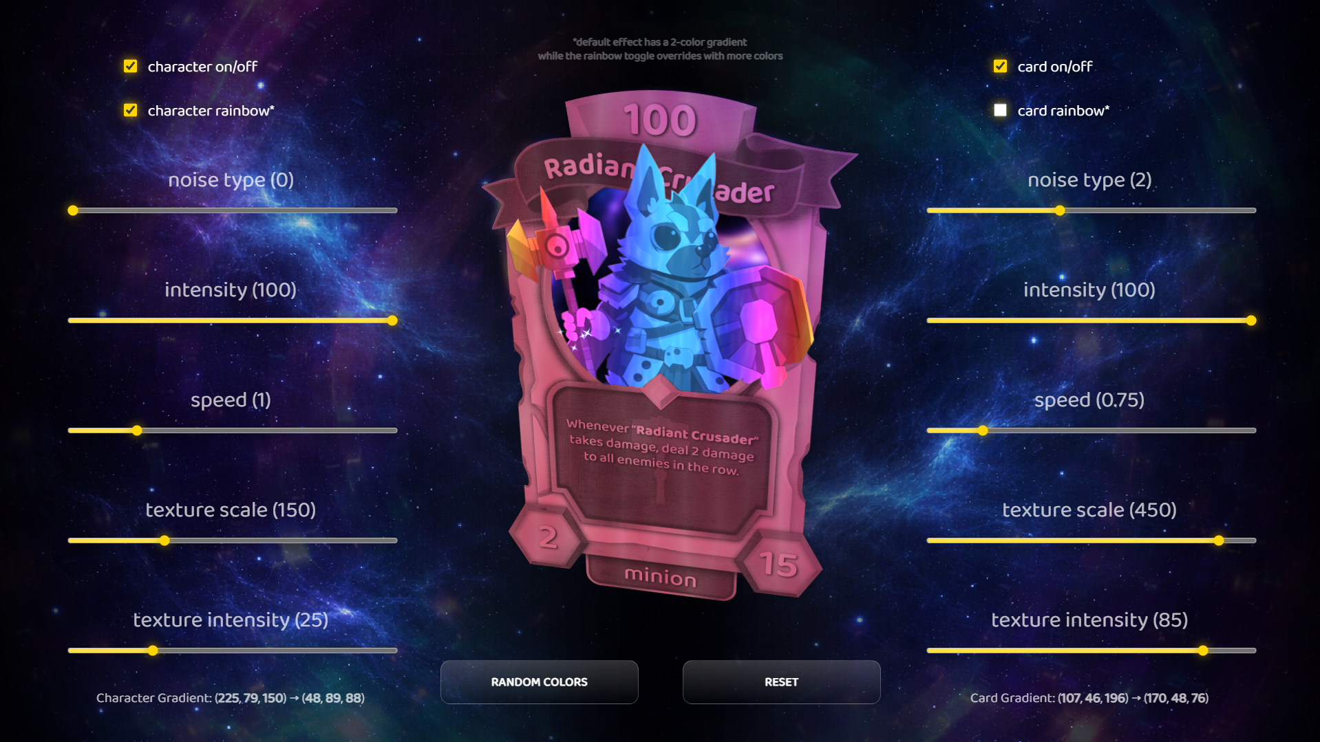 - ๐จ Custom Gradient — pick any two colors (gold/pink, cyan/purple, etc.). Not included in the demo, but you can see example colors below and find random combinations using the "Random Colors" button.